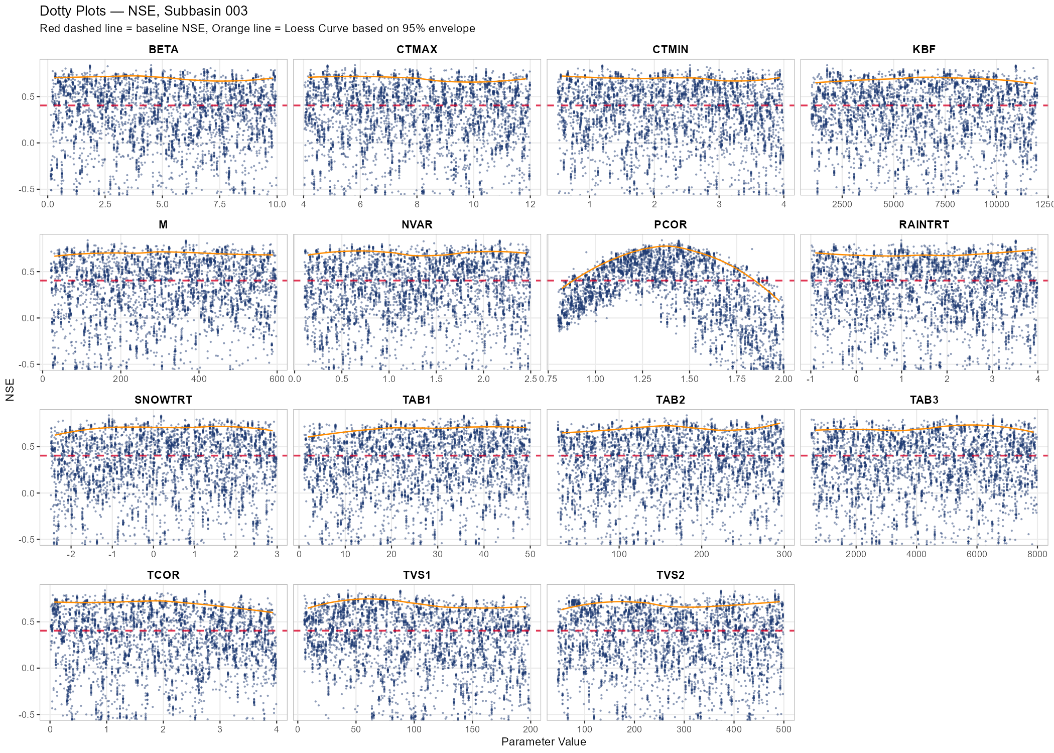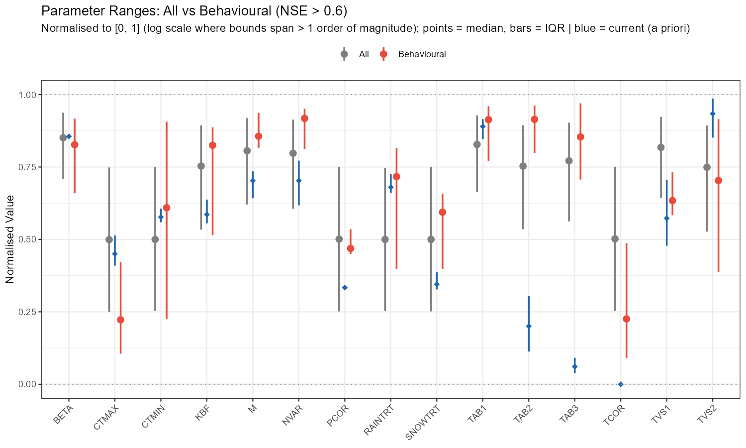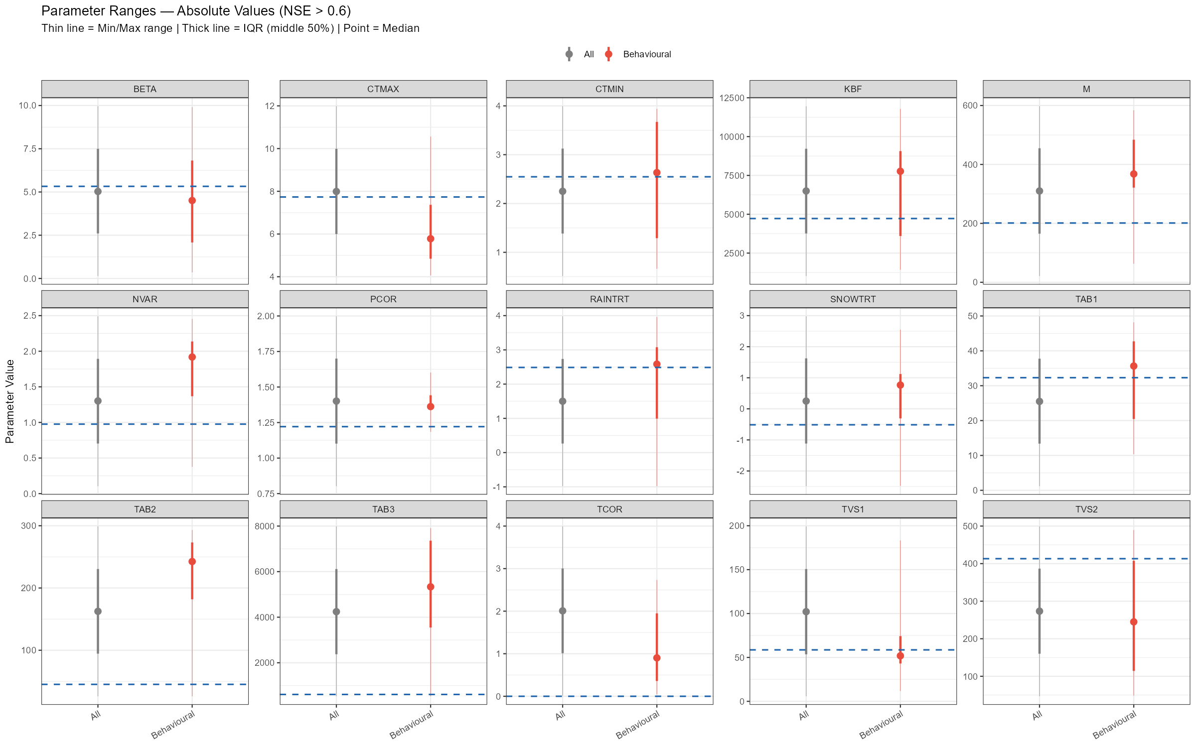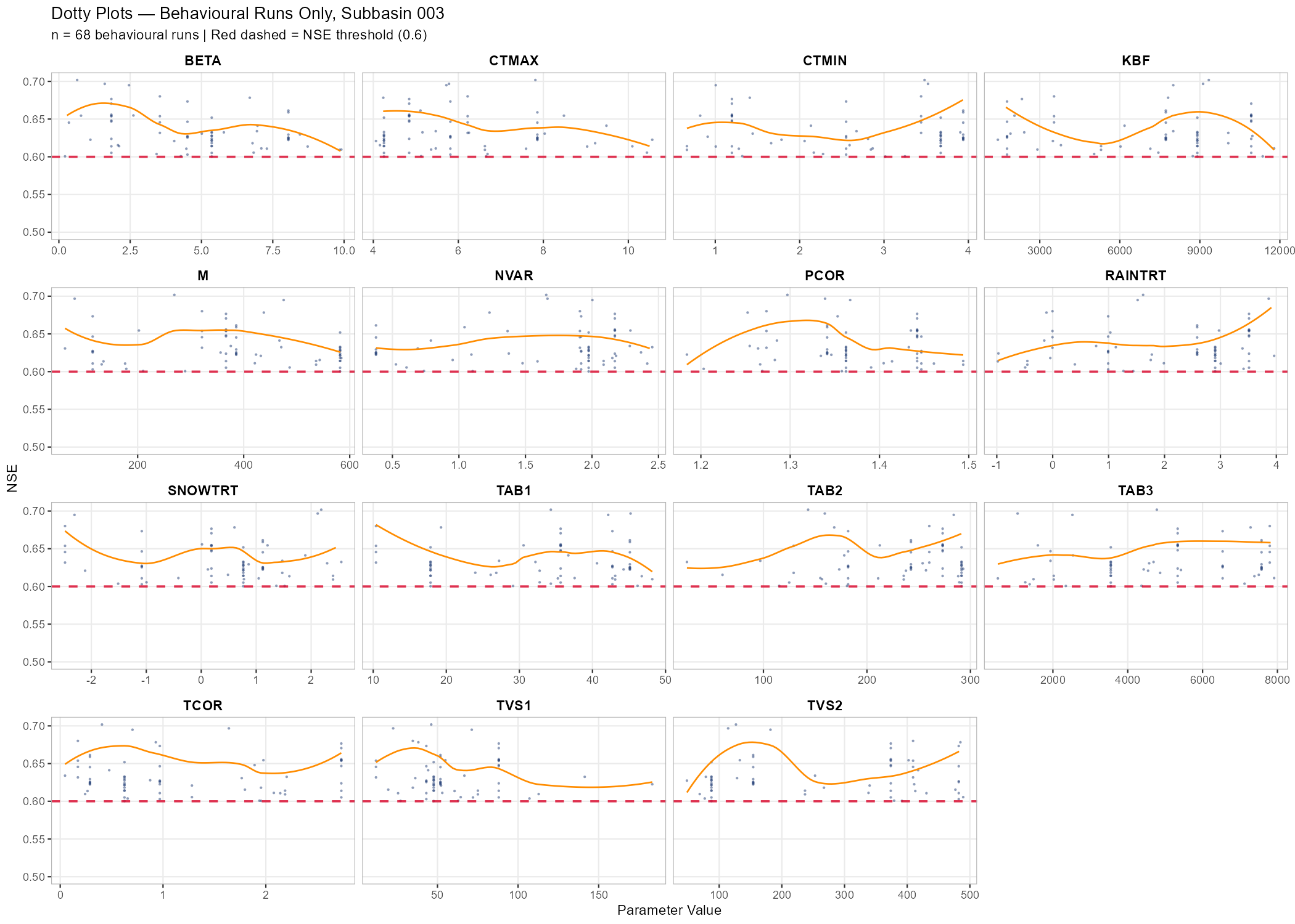 subtitle = sprintf("n = %d behavioural runs | Red dashed = NSE threshold (0.6)", n_behav))