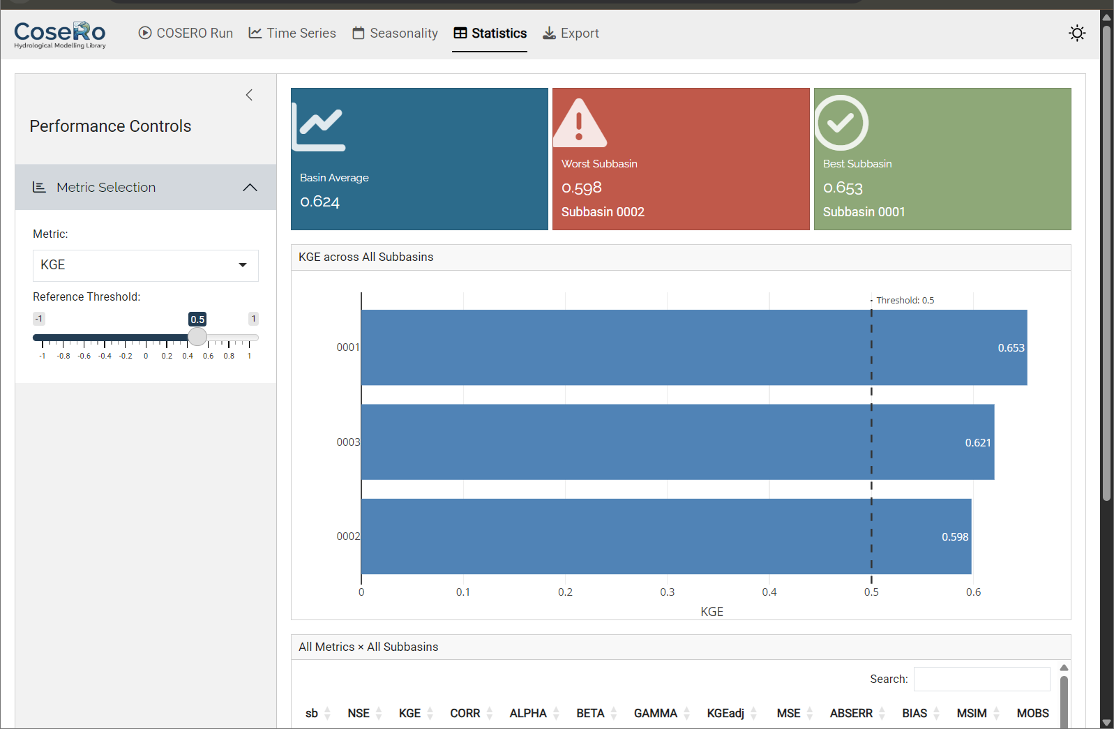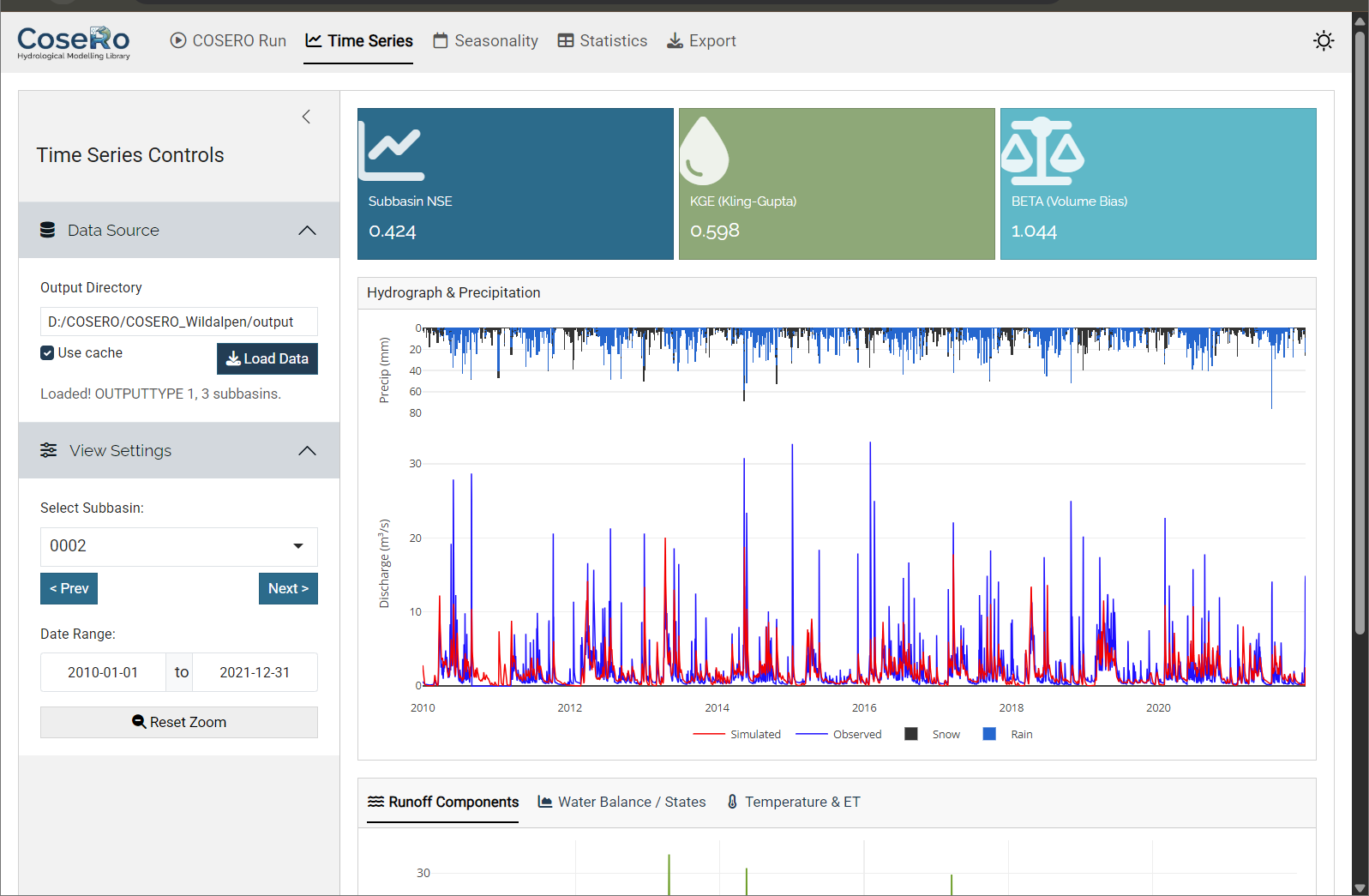 - Value boxes: NSE, KGE, and volume bias (BETA) for the selected subbasin