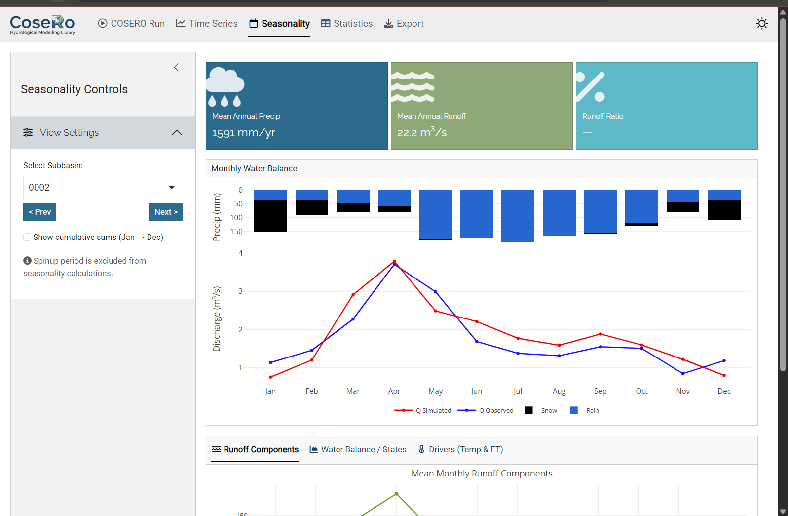 - Monthly runoff components and water balance breakdown