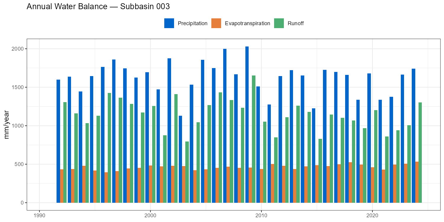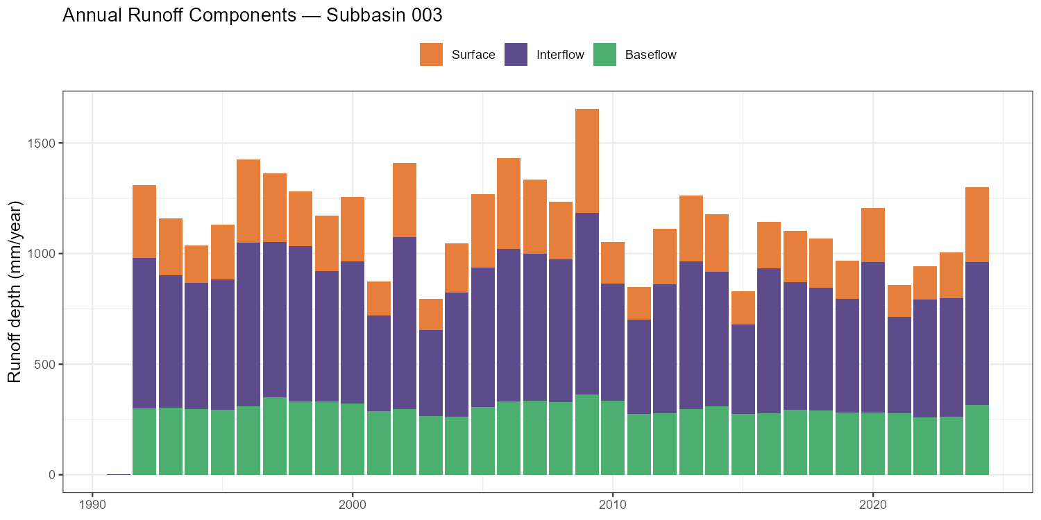 Water balance. Inspect the annual water balance table: are the residuals (P − ET − Q − ΔS) small relative to P? Are the annual ET and Q totals credible given the catchment’s climate and elevation? Describe what each of the three runoff components (surface runoff, interflow, baseflow) represents and which pathway dominates in your catchment.