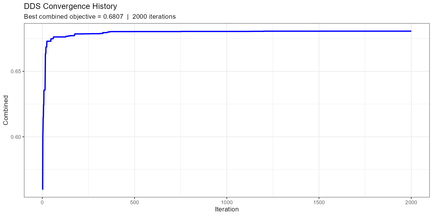 DDS calibration. Explain the DDS algorithm’s core principle (progressively reducing the probability of perturbing each dimension as iterations increase). Run a calibration, interpret the convergence plot, and compare initial versus calibrated performance for each subbasin. Know when to consider SCE-UA as an alternative.