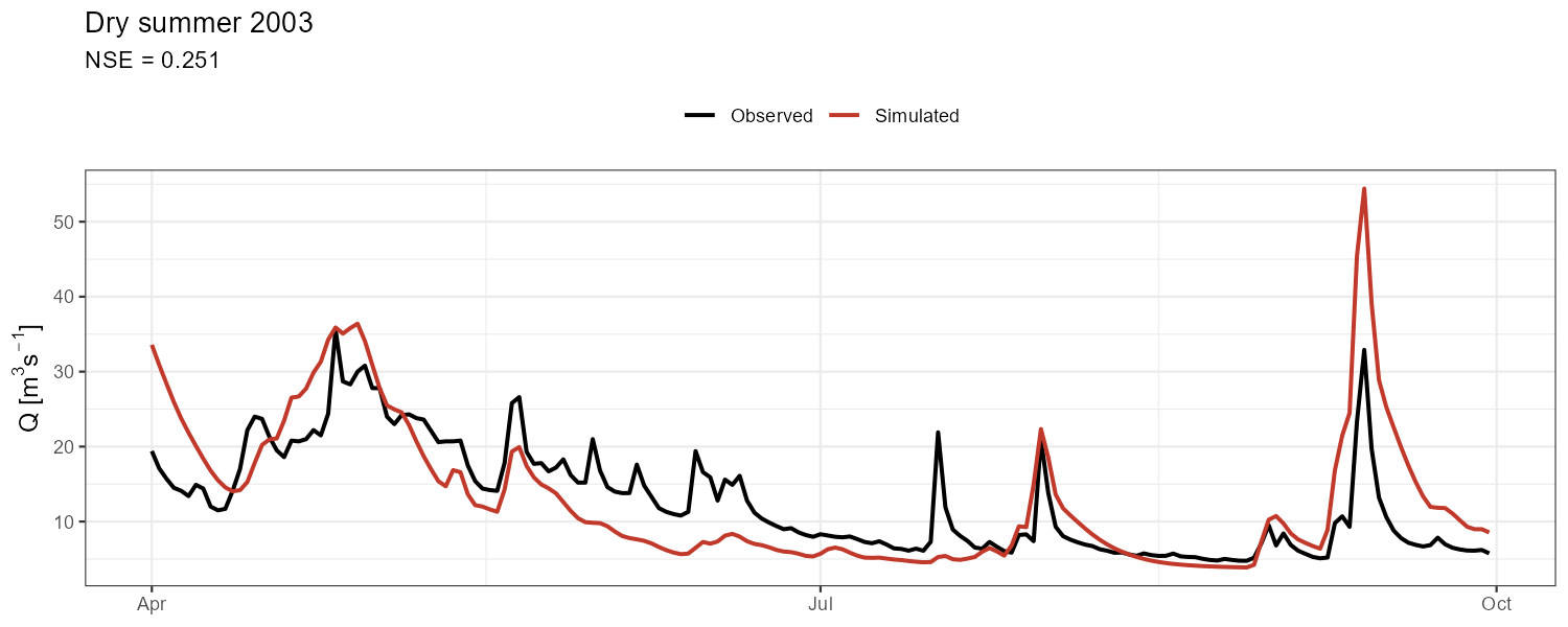 No hydrological model is “correct”. A high calibration NSE means the optimiser found parameter values that minimise the chosen error metric over the calibration period. It does not prove that the model correctly represents internal processes, that the parameters are physically meaningful, or that the model will perform well under changed conditions. In your presentation, always report: