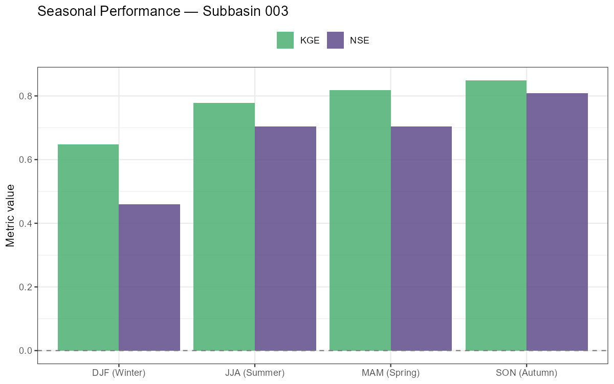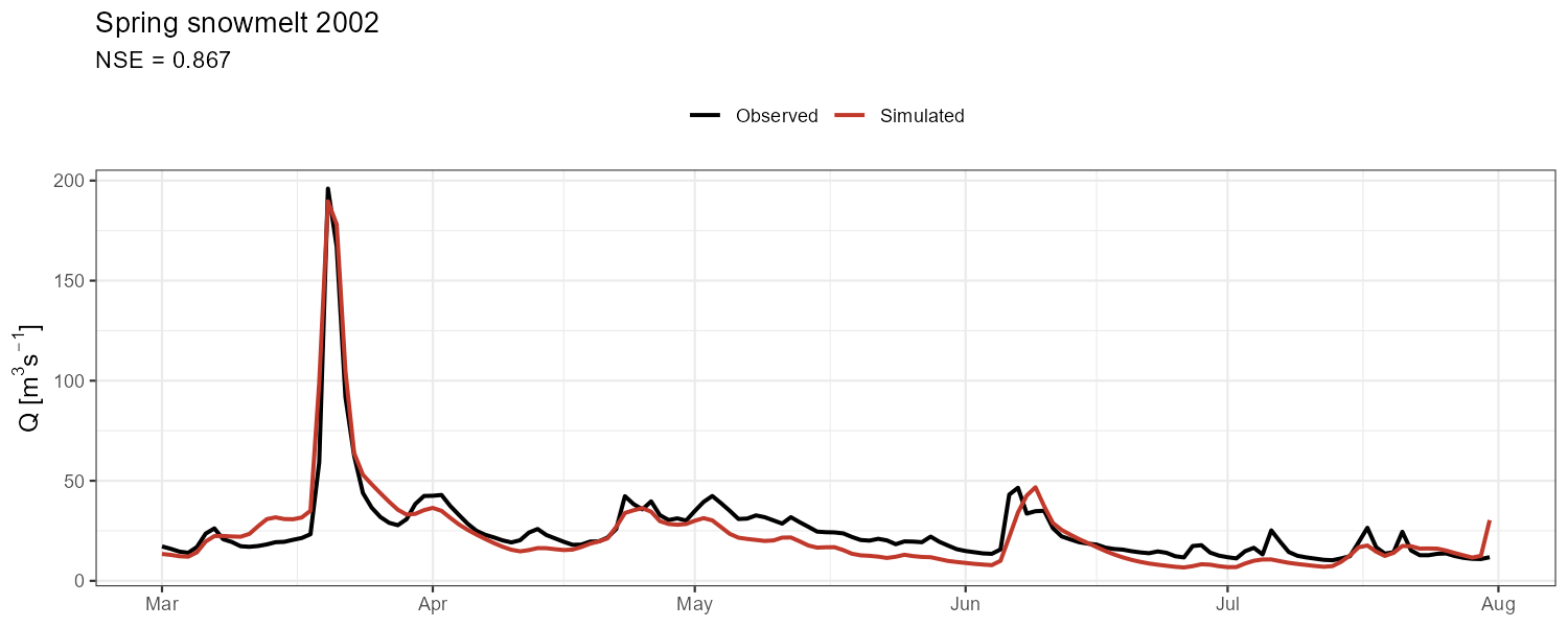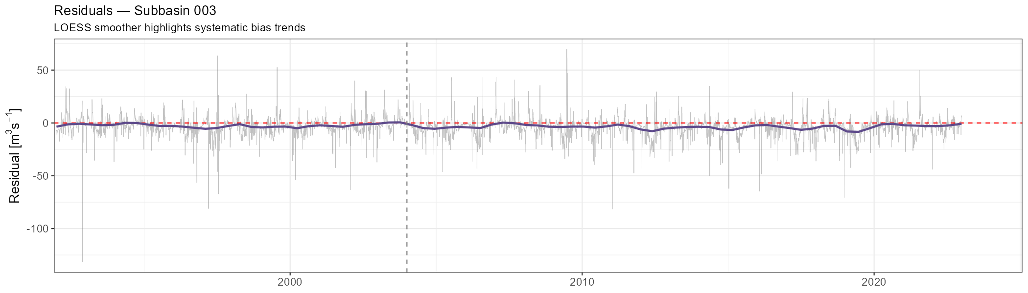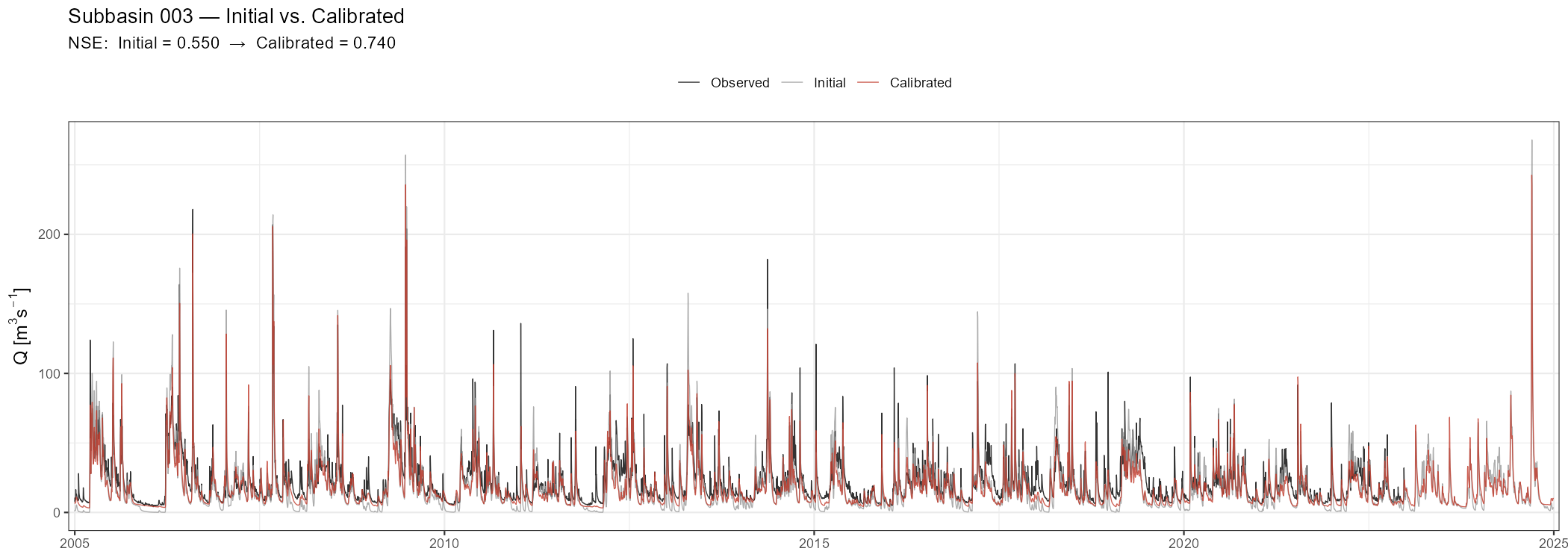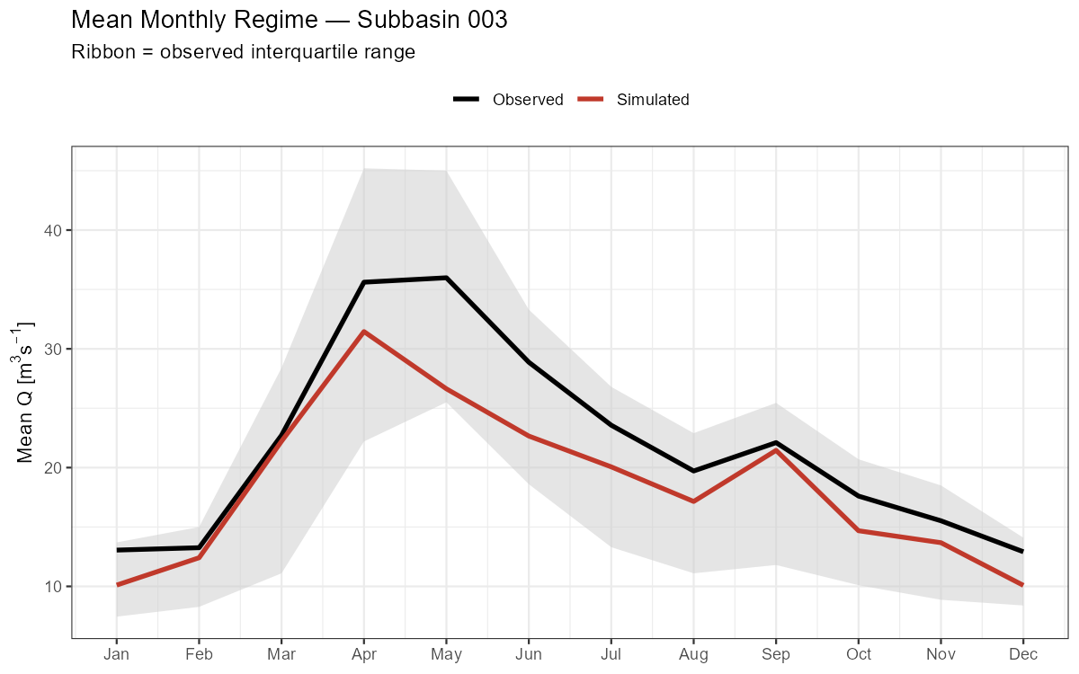 - Runoff ratio Q/P: Alpine catchments typically 0.50–0.80. Values above 1.0 indicate a structural error.
