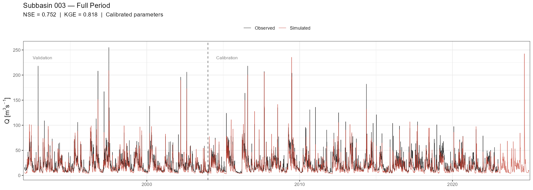 Validation tests whether the calibrated parameter set generalises beyond the data the optimiser saw. The standard approach is the split-sample test (Klemeš, 1986): you divide your data record into two non-overlapping periods, calibrate on one, and evaluate on the other without touching any parameters.